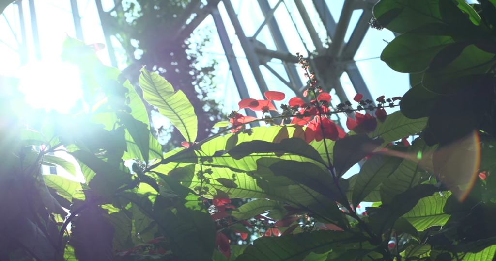 Fotografía de un invernadero donde la luz solar se filtra a través de una exuberante vegetación tropical.