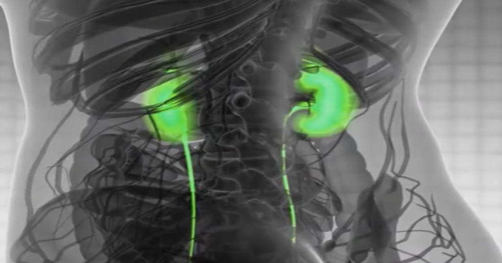 Visualización 3D del sistema urinario humano, destacando la ubicación y anatomía de los riñones y uréteres.