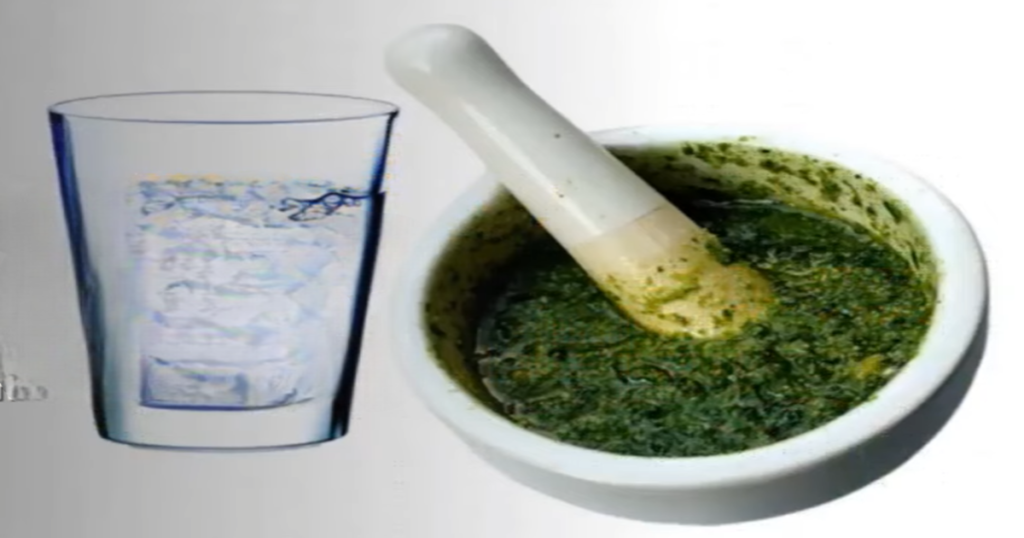 Preparación de pesto casero en un mortero de piedra, junto a un vaso de agua con hielo.