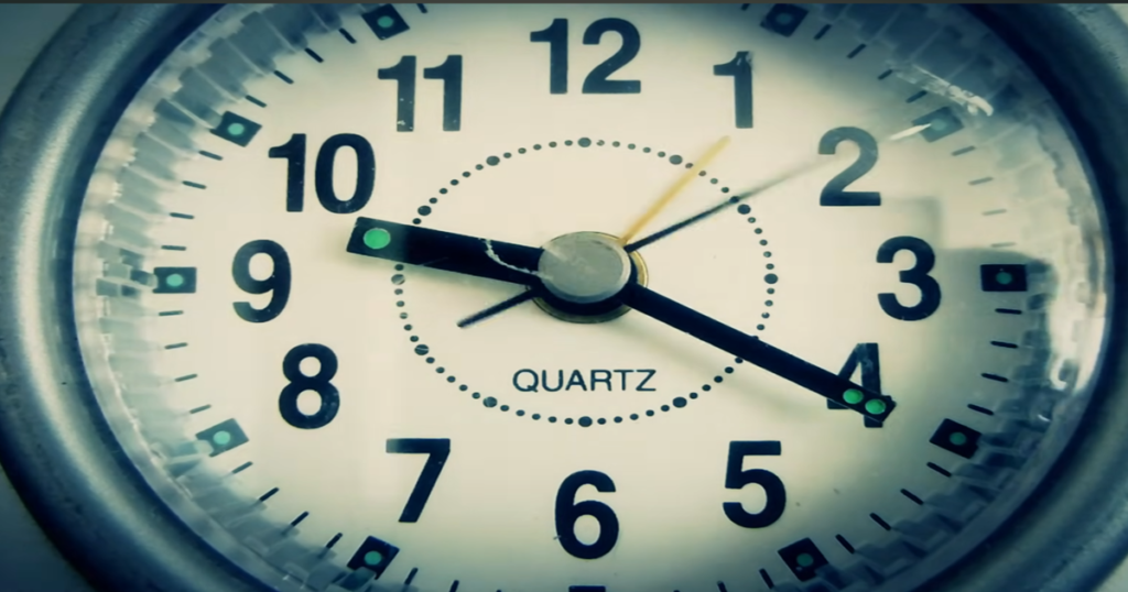 Primer plano de un reloj de cuarzo analógico con manecillas que marcan las horas y los minutos